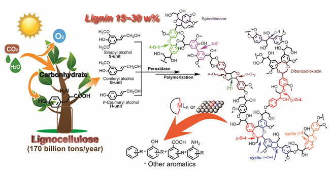木质素约占木质纤维素总质量的15%至30%,其结构中含有丰富的官能团化芳香结构,可以作为制备芳香化学品的原料。然而,木质素因为其结构中存在稳定的醚氧键、碳碳键以及复杂的连接方式,其高效催化解聚为收率可观的芳香单体至今仍然是一项具有挑战性的工作。