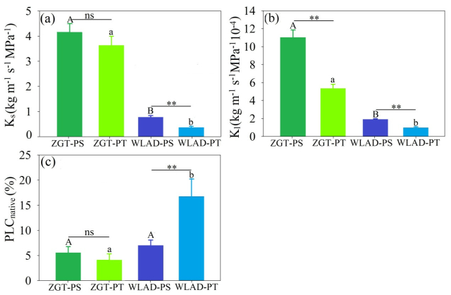 图1. 章古台与乌兰敖都樟子松、油松的边材比导率(Ks)、叶片比导率(Kl)及木质部栓塞百分比(PLC)。ZGT-PS、ZGT-PT分别表示章古台樟子松和油松;WLAD-PS、WLAD-PT分别表示乌兰敖都樟子松和油松。柱状图上方的“**” 、 “ns”分别表示同一采样区两个树种指标值差异显著(P < 0.05,n = 6)或不显著;柱状图上方的不同字母或相同字母分别表示同一个树种在两个采样区的指标值差异显著(P < 0.05,n = 6)或不显著