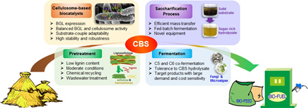 CBS工艺以可发酵糖作为产品,因此,使可发酵糖的生产成本低于淀粉糖成本,是将基于CBS工艺的木质纤维素生物转化技术应用于实际工业生产的前提。为此,该论文中详细讨论了未来进一步提高CBS糖化效率和糖产量的研究方向以及在CBS生物催化剂和工艺的优化方面需要解决的关键问题,包括提高CBS全菌催化剂对预处理衍生的抑制物的耐受性、优化纤维小体中不同功能组分的活力平衡、研制新工艺和配套装备提高糖化的传质效率以提高底物载量、提高预处理方法和下游应用技术与CBS工艺的兼容性等(图2)。