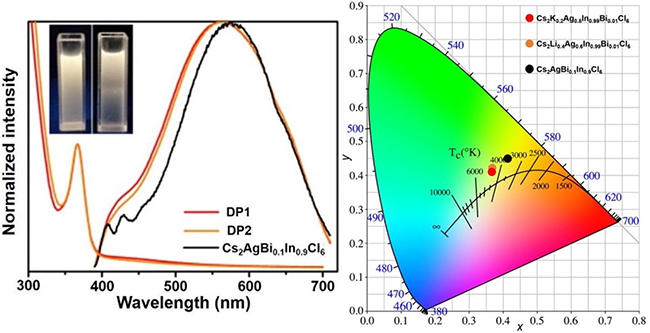 Cs2AgIn0.9Bi0.1Cl6、K+/Ag+、Li+/Ag+合金双钙钛矿纳米晶的荧光图及色坐标图