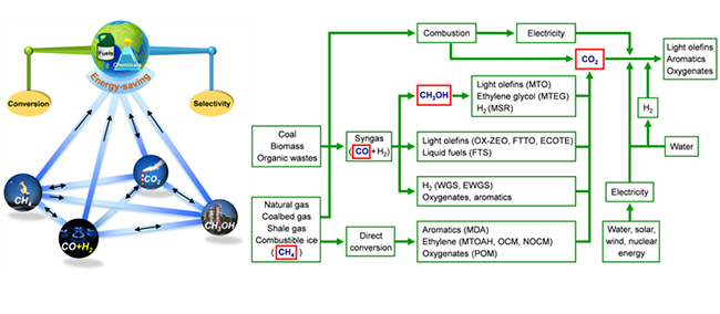 全球化石资源的逐渐消耗带来了日益严峻的环境污染问题,寻求低碳排放且高效转化碳一分子(CH4、CO2、CO、CH3OH等)为燃料或高值化学品的途径尤为重要。然而,由于碳一分子的化学性质差异大,如CH4、CO2等相对惰性;CH3OH、CO等相对活泼,在平衡转化率和选择性等方面存在一定的限制。目前工业上的碳一转化过程存在能耗高、步骤多、产品分离工艺复杂等问题。因此,探索温和条件下碳一分子定向转化技术是一个迫切但又极具挑战的课题。