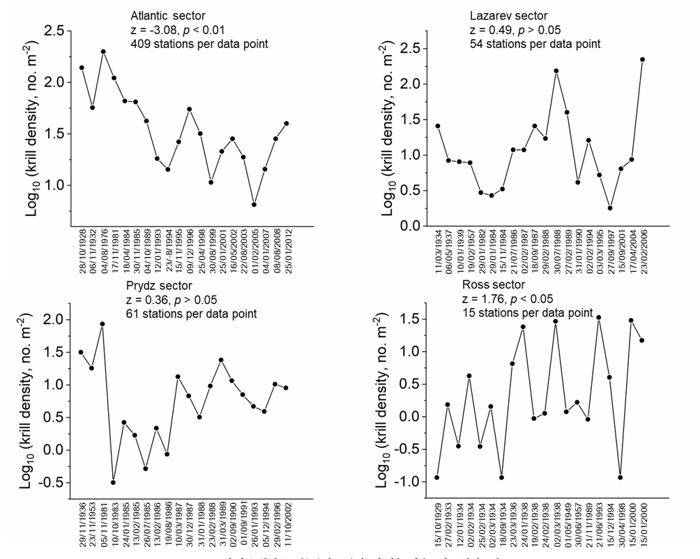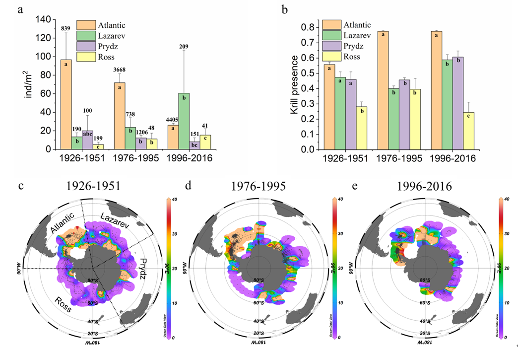 南极磷虾支撑了南大洋特殊的食物网并且是西南大西洋扇区商业捕捞的主要对象。此区域磷虾种群是否降低,近二十年存在广泛争论,这种不确定性为磷虾渔业的管理带来了大量不便。研究团队从更广的环南极尺度上提供了新的视角,将为南极周边海洋保护区建设和磷虾渔业的合理管理提供了基础数据支撑。