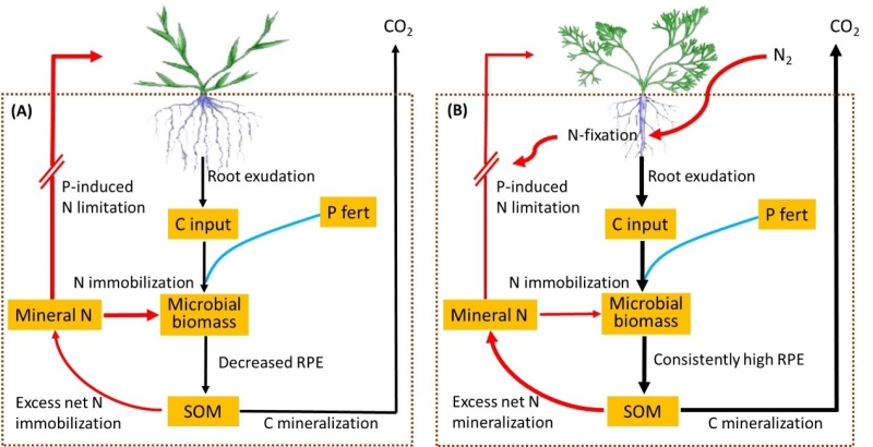 基于此,中科院沈阳应用生态所地下生态过程研究团队联合澳大利亚悉尼大学Feike A. Dijkstra团队对比了黑麦草(Lolium perenne)和白三叶草(Trifolium repens)在施磷和不施磷(4 g P m-2)条件下,种植后30天,44天和58天的根际激发效应的动态差异。研究发现,白三叶草比黑麦草在生长后期产生更大的根际激发效应,这可能是由于白三叶草后期的地上生物量再生率、根际活力和根际沉积物较大。施加磷肥降低了黑麦草生长后期的根际激发效应,而对白三叶草的根际激发效应无显著影响。背后的机制在于,磷肥和根系分泌物的碳输入诱导了更多的微生物氮固持,导致土壤氮限制对植物生长产生负向影响,继而降低了黑麦草的根际激发效应(图A)。然而,磷肥诱导的微生物氮固持对白三叶草没有太大影响,因为三叶草的生物固氮可能缓解了土壤氮限制(图B)。总之,上述结果揭示了C-N-P的相互作用对于理解根际激发效应的重要性,这对探索植物-土壤系统中的磷循环具有重要意义。