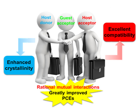 三元有机太阳能电池(ternary organic solar cells, TOSCs)作为一种有效拓宽光伏响应范围的策略,在近年来得到了国内研究人员的广泛关注并取得了快速发展。这主要得益于TOSCs具有和二元器件相似的简单制备工艺以及非富勒烯受体的蓬勃发展所带来的丰富材料来源,目前基于高效非富勒烯受体Y6体系的TOSCs光伏效率已经达到18%。TOSCs具有良好的机械性能,透光性和大面积加工的可能性,在半透明、柔性等电子器件领域有着巨大的发展潜力。然而并不是所有能级匹配、吸收光谱互补的材料都可以作为客体来制备三元器件。因为相对于主体二元体系来说,第三组分(客体)的引入可能会破坏原来二元共混膜内有序的分子堆积和纳米互穿网络,进而增加复合损失,降低能量转换效率。因此,第三组分需要与主体材料具有良好的兼容性,才能确保客体的引入是作为形貌调控剂而非复合中心或者形貌陷阱。主客体之间的兼容性虽然可以通过一些测试手段来研究,然而对于第三组分的选择目前更多的是基于经验或者试错法。
