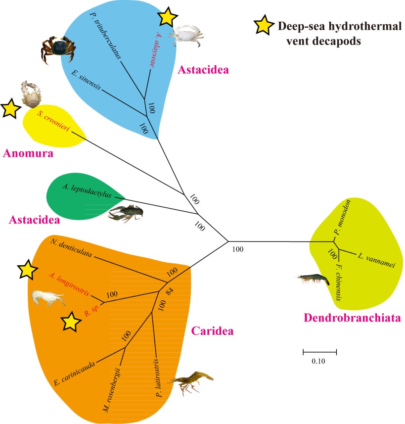 近日,进化生物学Top期刊Molecular Ecology在线刊发海洋所李富花研究组完成的题为“Adaptation and molecular evidence for convergence in decapod crustaceans to deep-sea hydrothermal vent environments”的研究论文。该研究首次发现深海热液甲壳动物趋同进化的表型及分子证据,揭示了白色体色和化能合成营养代谢的关键遗传机制,为揭秘深海物种环境适应的独特机制提供了新的理论依据。