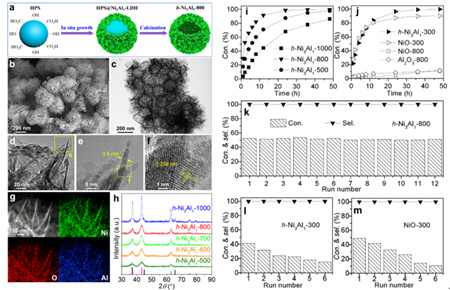 近日,青岛能源所王光辉研究员带领的多孔催化材料研究组联合中国科学技术大学张文华副教授报道了一种新型的、具有空心结构的Ni-Al水滑石基金属氧化物催化剂,该催化剂在 , -不饱和醛转移加氢制备 , -不饱和醇反应中表现出优异的活性、选择性以及稳定性。首先,该工作通过硬模板的方法(图1a),构筑了Ni-Al基氧化物空心结构(图1b-h),提高了催化剂的比表面积、孔隙率,增加了催化剂暴露的活性位点,同时有利于反应的传质扩散。另外,由于Ni +(2< <3)型酸-碱活性位的形成,Ni-Al基氧化物催化剂经过循环使用12次,没有失活现象,表现出优异的催化稳定性,而且循环过程中 , -不饱和醇的选择性始终大于99%(图1i-m)。进一步,Ni-Al基氧化物及转移加氢体系对于多种 , -不饱和醛的转移加氢反应均表现出优异性能,具有很好的工业化应用前景。