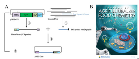 图1. 高产EPA的裂殖壶菌细胞工厂构建 A基于2A肽的裂殖壶菌多基因表达体系构建;B内页封面图案