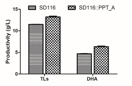 青岛能源所代谢物组学研究组长期以来致力于裂殖壶菌的遗传改造、作用机制及代谢工程研究,通过人工改造裂殖壶菌提高其EPA/DHA产量,用于补充现有PUFAs产品的不足。近日,该研究组基于病毒2A肽自剪切的特点,成功开发了基于2A肽的裂殖壶菌的多基因表达体系,实现了裂殖壶菌的多基因表达(图1A),并利用该体系将外源的EPA合成基因簇在裂殖壶菌中进行异源表达,使得EPA产量提高5倍。该成果被食品科学领域的知名期刊Journal of Agriculture and Food Chemistry以内封面文章的形式报道(图1B)。同时,该研究组通过生物信息学方法首次鉴定到特异性作用于裂殖壶菌PUFA合成途径的磷酸泛酰巯基乙胺基酰基转移酶(Phosphopantetheinyl transferase,PPTase)。通过生理生化实验确定该PPTase的功能特性,并将其在裂殖壶菌中进行过表达,使得裂殖壶菌的DHA和PUFA产量分别提高36%和18%(图2)。相关成果也已发表于Biotechnology for Biofuels。