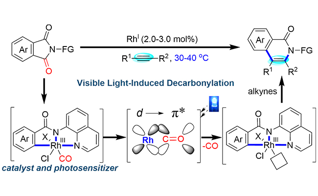 近日,中国科学院大连化学物理研究所陈庆安研究员团队在可见光诱导酰亚胺温和条件下脱羰研究方面取得新进展,发展了一种“双功能铑催化剂在可见光诱导下脱羰”的新策略,可以实现酰胺类化合物在温和(30-40 )条件下的脱碳,以及与炔烃的加成反应。