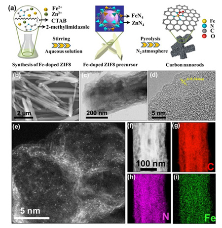 近日,青岛能源所梁汉璞研究员带领的能源材料与纳米催化研究组,在利用可循环再生的生物质制备Fe1单原子(Carbon, 2020, 157, 614-621. DOI: 10.1016/j.carbon.2019.10.054.)和Fe1Pt1双单原子(ACS Sustain. Chem. Eng. 2021, 9, 1, 189–196. DOI: 10.1021/acssuschemeng.0c06558.)的基础上,又开发出了一种步骤简单、过程环保的合成方法用来制备具有氮掺杂的多孔碳纳米棒负载的Fe单原子催化剂(图1a)。该方法实现了在水系中合成具有Fe均匀掺杂的金属有机框架材料前驱体,后续经过一步高温热解,在不需要经过酸洗处理的情况下即可获得高度均匀分散的Fe单原子催化剂。所合成的催化剂电镜表征见图1(b-i)。该催化剂展现了优良的氧还原催化活性和长时间稳定性。在碱性介质中,其起始电位和半波电位比商业Pt/C催化剂分别高出了30 mV和60 mV。经过20小时的稳定性测试,商业Pt/C催化剂损失达到了53%而所合成催化剂仅损失5%。在酸性介质中也展现出了较好的催化性能。作为负极材料组装到锌空电池当中,实现了142 mW cm-2的高功率密度,比商业Pt/C电池高出了近58 mW cm-2,并优于大多数已经报道的过渡金属单原子催化剂。该研究工作为简单、绿色地合成氮掺杂碳负载Fe单原子电催化剂提供了一种有效途径。相关成果近期发表在《ACS Sustainable Chemistry & Engineering》杂志上(ACS Sustainable Chem. Eng. 2021, 9, 137-146)。