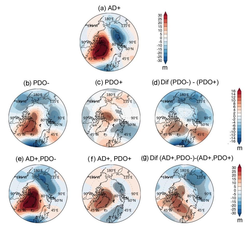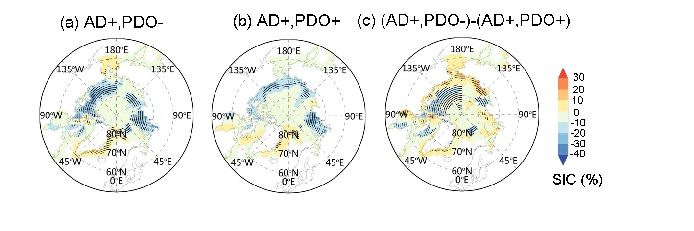太平洋年代际变化(Pacific Decadal Oscillation,PDO)是描述北太平洋海温变化的重要指数,目前有少量研究指出PDO可对北极地区的大气环流造成一定影响,但没有指出PDO与北极大气环流在何种配置情况下会对夏季北极海冰减少产生显著影响。近日,海洋所黄海军课题组研究人员首次揭示了太平洋年代际变化的相位更迭对夏季时期北极偶极子DA大气环流模式以及太平洋扇区海冰变化的调控机制。
