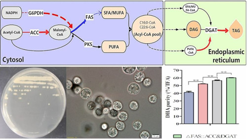 该研究利用代谢工程手段对裂殖壶菌脂肪酸合酶途径进行弱化,获得裂殖壶菌突变株的生长速率、最终生物量和总脂肪酸产量没有发生明显变化,但显著提高了脂质中DHA的比例。在此基础上,通过过表达油脂合成途径的关键酶乙酰辅酶A羧化酶和二脂酰甘油酰基转移酶,进一步提高裂殖壶菌的总脂肪酸产量和脂质中DHA的纯度,而生物量和细胞生长速率不受影响,确保获得的突变株符合工业化生产需求。