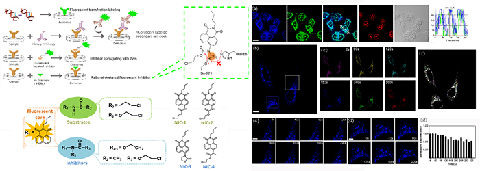 近日,中国科学院大连化学物理研究所复杂分子体系反应动力学研究组研究员韩克利团队基于氨基甲酸酯母核的结构与功能关系,设计并发展了小分子抑制剂型荧光探针(SMI-probe),在重要的药物代谢酶羧酸酯酶(Carboxylesterases,CEs)的实时荧光高分辨检测中取得了良好的应用效果。由于抑制剂型探针分子NIC-4的分子结构简单,体积小,且具有针对CEs的超分辨响应灵敏度,因此在细胞原位检测中能够获得更加真实的成像效果,为亚细胞器层面的酶标记提供了新的设计思路与成功范例。