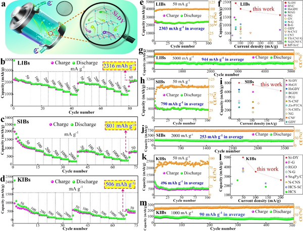 通过固体核磁、扫描电镜、透射电镜、拉曼、红外、X射线光电子能谱、同步辐射等表征,结合理论计算模拟,证实了Si-DY的三维精确骨架结构。研究发现,Si-DY本身具有大量的炔键和分层级的孔洞构造,能够提供丰富多样的离子存储位点和传输通道,在碱金属离子如Li、Na、K的存储方面均表现出了优异的性能。理论计算表明, Si-DY的Li、Na、K理论存储容量分别为3674, 2810, 1945 mA h g-1,同时,在实验中也得到了高达2350, 812, 512 mA h g-1的Li、Na、K实际比容量,表明三维多孔的Si-DY在实际储能方面具有巨大的应用优势。在与其他众多碳基材料甚至是硅基材料比较之下,Si-DY作为多功能负极在电池中展现了包括超长循环稳定性和卓越倍率性能的优秀电化学存储表现(如图所示)。