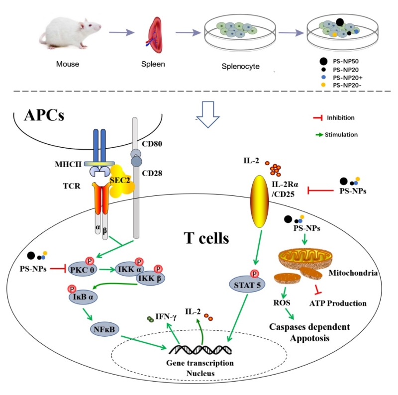 研究发现,不同粒径、不同电荷的聚苯乙烯纳米塑料均可进入小鼠脾淋巴细胞内部,并在高浓度下造成免疫细胞活力的显著降低,诱导发生细胞凋亡。在免疫功能方面,纳米塑料可显著抑制T淋巴细胞的活化,下调细胞表面标志物的表达,抑制 CD8+毒性T 淋巴细胞的分化及相关细胞因子的分泌。毒理机制方面,纳米塑料显著抑制T淋巴细胞活化的关键信号通路PKC -NF B 和 IL-2R/STAT5,从而影响其免疫功能的发挥。研究还发现纳米塑料的毒理效应与粒径、表面电荷、染毒浓度和作用时间密切相关。带负电和不带电的纳米塑料可导致胞内活性氧自由基(ROS) 的累积从而影响线粒体功能,而带正电的纳米塑料直接导致线粒体膜电位的去极化。研究成果可为纳米塑料污染的生态风险预测提供科学依据。