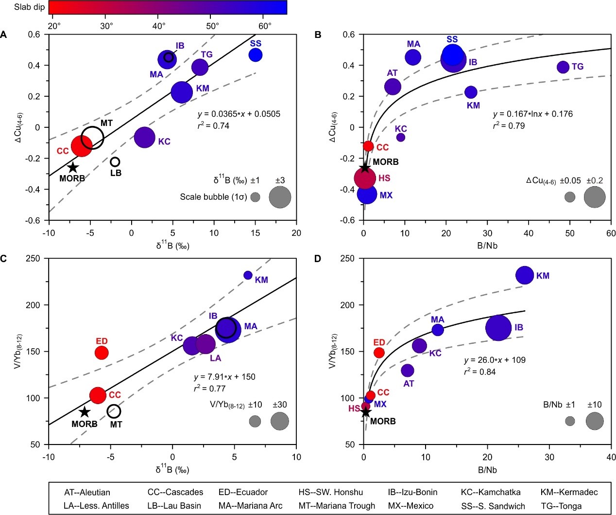 为了探究俯冲蛇纹岩与弧岩浆氧逸度之间是否存在关联,曾志刚研究团队试图从全球俯冲带数据寻找答案。研究人员发现,氧逸度对弧岩浆中铜(Cu)的行为具有重要影响,因此利用岩浆演化过程中Cu的富集/亏损程度( Cu)作为岩浆氧逸度的指示指标。此外,还采用实验岩石学获得的另一氧逸度指标—V/Yb。钒(V)是变价元素,具有氧化还原敏感性,而镱(Yb)则没有,并且V/Yb不受地幔部分熔融程度和地幔亏损程度的影响,这一点要优于V/Ti(钛)。研究人员利用硼同位素( 11B)和B/Nb(铌)比值作为俯冲蛇纹岩的指示剂,探讨其与氧逸度指标( Cu、V/Yb)之间的关系,发现两种指标在全球尺度上呈现良好的正相关关系,说明俯冲蛇纹岩对弧岩浆氧逸度具有重要的影响。需要注意的是,该研究没有排除蚀变洋壳的贡献,也没有完全证明蛇纹岩流体是氧化性的,因为最新研究表明,单纯水的加入也可能引起地幔楔的氧化。