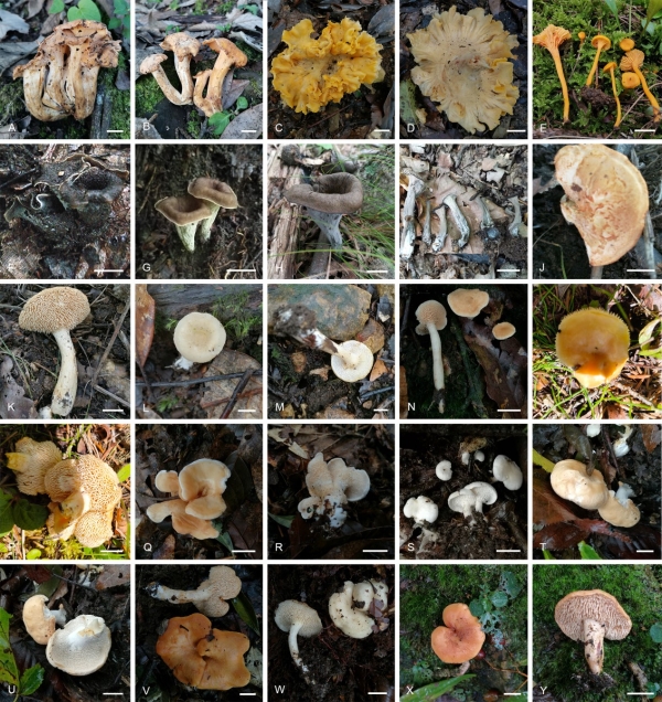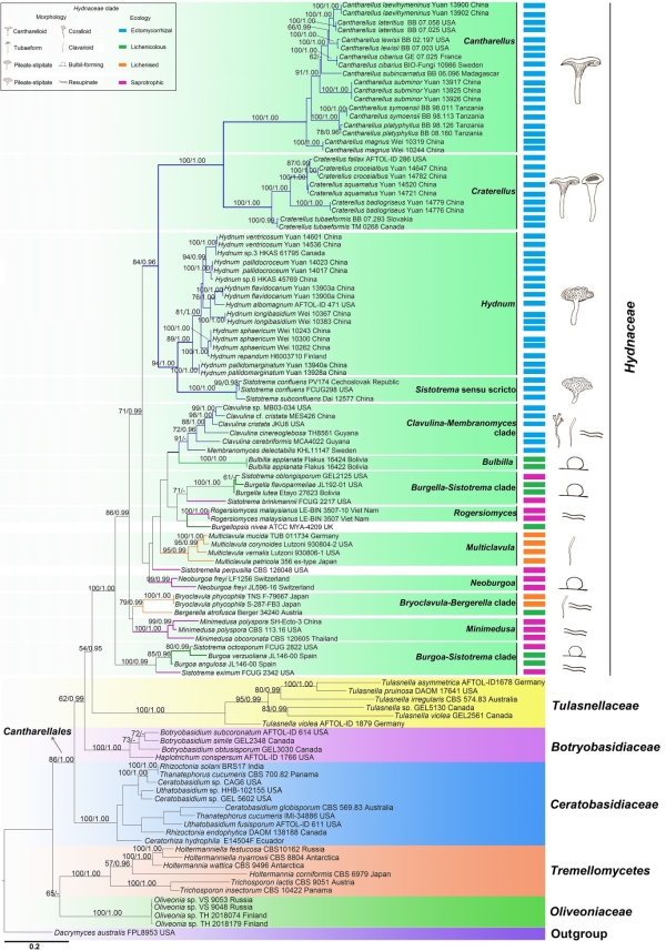 中国科学院沈阳应用生态研究所生物多样性组袁海生研究员团队开展了对中国齿菌科真菌,特别是伞形类群的研究,分别对该科中鸡油菌属、喇叭菌属、齿菌属的属内系统发育关系进行梳理,采用5个基因片段(nrLSU+ITS+mtSSU+RPB2+TEF1)联合数据集,以最大似然分析和贝叶斯推导重建了鸡油菌目系统发育树,阐明了齿菌科在鸡油菌目中的分类地位,确认了包含在齿菌科分类单元下的17个属;拟合生态学、形态学、系统发育学特征初步推测了齿菌科物种由腐生、藻类共生/地衣寄生、到树木共生的生态学演化过程,以及由菌核状、匍匐状、珊瑚状到伞形的形态学演化规律;研究建立、描述和报道了三属共29个新分类单元,包括8个新亚属,17个新物种,2个同物异名种以及2个中国新记录种。研究对进一步探讨该类群真菌与宿主协同进化,以及真菌形态、生态演化规律等具有重要参考价值。