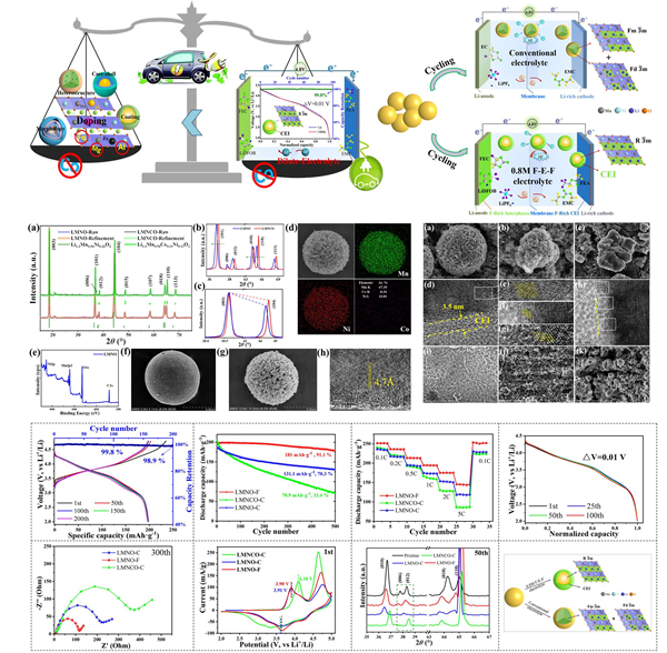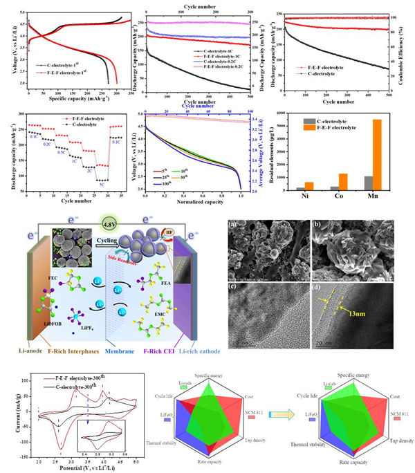 在高镍三元LiNi0.8Co0.15Al0.05O2(NCA)正极材料方面,研究团队巧妙设计,通过由内而外修饰方法成功开发出一种氧化铝包覆的镁掺杂NCA(Al2O3@Mg/NCA)体系。以该方式构建的NCA材料具有稳定的内部结构,通过抑制材料内部相变和阳离子掺杂,在抑制副反应发生的同时实现了体系内部快速的电子传输。在1C的倍率下,电池历经250次循环,容量仍能保持在95%以上。该工作为NCA材料的商业化道路奠定了基础,也为动力电池正极材料的设计与改性提供了新的发展思路。随着电动汽车对高能量密度电池需求的增加,包括NCA在内的部分正极材料的能量密度已不能满足需求,严重限制了纯电动汽车的续航里程。富锂锰基正极材料因其高比容量、高能量密度、低成本等优点,非常适合用于新一代高能量密度锂离子动力电池。但是其材料自身低首效、循环及倍率性能差、电压衰降严重的本征缺陷,以及缺乏相匹配高压电解液等问题制约了商业化应用和发展。研究团队独辟蹊径,通过电解液一步法原位改性,成功开发出一种全性能富锂锰基电池体系相关研究,结果发表在ACS Applied Materials & Interfaces《应用材料与界面》。通过SEM/TEM/XPS/ICP-AES等一系列测试,证实在正负极表面原位包覆形成了含氟的坚固致密CEI保护膜,既稳定了正极材料结构,又抑制了电解液分解对正极材料造成的腐蚀,有效减少了金属离子的溶出,从而大幅提升富锂锰基正极材料的综合电化学性能。改性后的富锂正极材料首次放电比容量达到300mAh g-1,在0.5C倍率下经过500次充放电循环后容量保持率高达88%。同时,电池循环过程中的电压衰降也得到很好的改善,为富锂锰基正极材料的改性和商业化应用提供了新的思路(图1)。