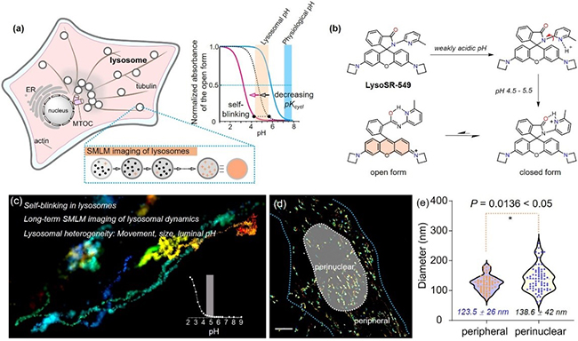 溶酶体是多功能细胞器,在降解生物分子、介导细胞代谢和细胞信号传导中发挥作用。溶酶体功能障碍在溶酶体贮积症、神经退行性疾病和癌症中的作用也已得到证实,使得溶酶体成为疾病治疗靶点之一。溶酶体多重功能是通过溶酶体与其他细胞器的融合或接触来实现,并由溶酶体动力学介导,包括溶酶体的运动、溶酶体数量、大小、形态和腔内酸性变化等。越来越多的证据表明,每个具有不同位置、运动轨迹和化学成分的溶酶体都具有特定的功能;但溶酶体又同时受到系统水平上的调节,以溶酶体簇等集体行为在整个细胞内发挥功能。破译全细胞溶酶体的空间分布、化学成分和动力学可以了解和发现溶酶体的多功能和作用网络,解析溶酶体个体功能与系统调控之间的关系。但溶酶体腔内是pH为4.5至5的酸性环境,使得荧光探针无法在此条件下实现长时间的时空超分辨和对溶酶体酸性的动态识别。