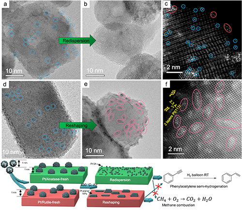 近日,中国科学院大连化学物理研究所催化与新材料研究室杨冰副研究员和催化基础国家重点实验室李杲研究员,以及大连理工大学周思研究员等合作,发展了载体晶相调控Pt/TiO2动态结构演变的新方法,成功实现对活性金属分散度、几何结构的精准控制,以及对反应性能的定向优化。