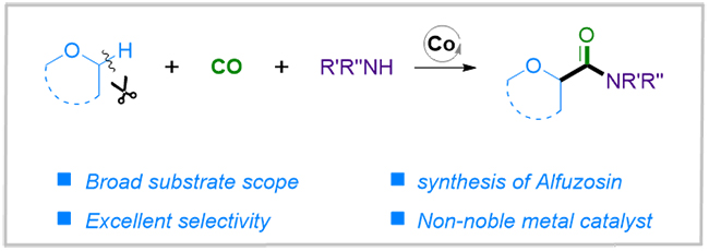 吴小锋团队长期致力于各种不同羰基化反应的研究,本工作中,该团队在前期工作的基础上,发展了一种新颖的羰基化策略:利用惰性醚作为羰化底物、廉价金属钴作为催化剂,在二叔丁基过氧化物存在下,实现醚类化合物的羰基化反应。团队利用该策略,构建了一系列 -酰胺基取代的醚类衍生物,并获得了中等收率的可市售药物阿夫唑嗪。