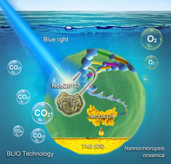 在寻觅诱导TAG合成新方法的过程中,单细胞中心博士后张鹏和副研究员辛一带领的研究小组在工业产油微藻Nannochloropsis oceanica(海洋微拟球藻)中,发现了一个前所未知的“BlueLight-NobZIP77-NoDGAT2B”通路。当培养环境中氮素丰富时,蓝光感应转录因子NobZIP77会通过与目标DNA调控序列的结合,抑制NoDGAT2B等TAG合成酶的转录表达,从而关闭了TAG生产线。然而,当环境中氮素耗尽时,细胞中通常吸收蓝光的叶绿素a会减少,导致更多蓝光进入NobZIP77所在的细胞核。这样,暴露在蓝光下的NobZIP77会从其目标DNA调控序列上解离,因此NoDGAT2B等TAG合成酶的转录表达被“解锁”,从而触发TAG的生产。