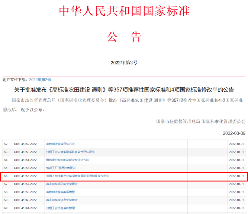 近日,由中国科学院沈阳自动化研究所牵头制定的“机器人制造数字化车间装备互联互通和互操作规范”正式发布,成为我国国家标准(国家标准编号为GB/T 41256-2022),并将于2022年10月1日出版实施。