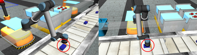 传送带上机器抓取对比(左侧失败,右侧成功)