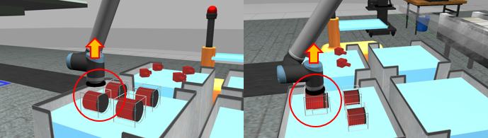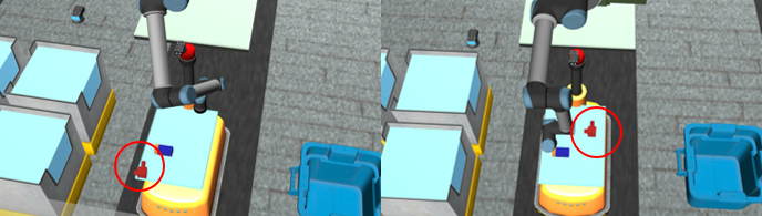 信息物理生产系统为制造过程的调度和控制提供了灵活和开放的机制,为进一步提高系统性能,调度和控制联合优化(JSC)逐渐成为研究热点。在给定优化目标的情况下,JSC的解决方案不仅提供了调度计划,还提供了最优的控制参数。但是,由于生产系统的动态特性,不可能在一开始就考虑所有潜在情况来为 JSC 制定理想的解决方案。以国际竞赛ARIAC2021 环境为例, 典型的系统动态性包括新订单的插入, 机器抓取失败(如下图所示), 零件是次品等。