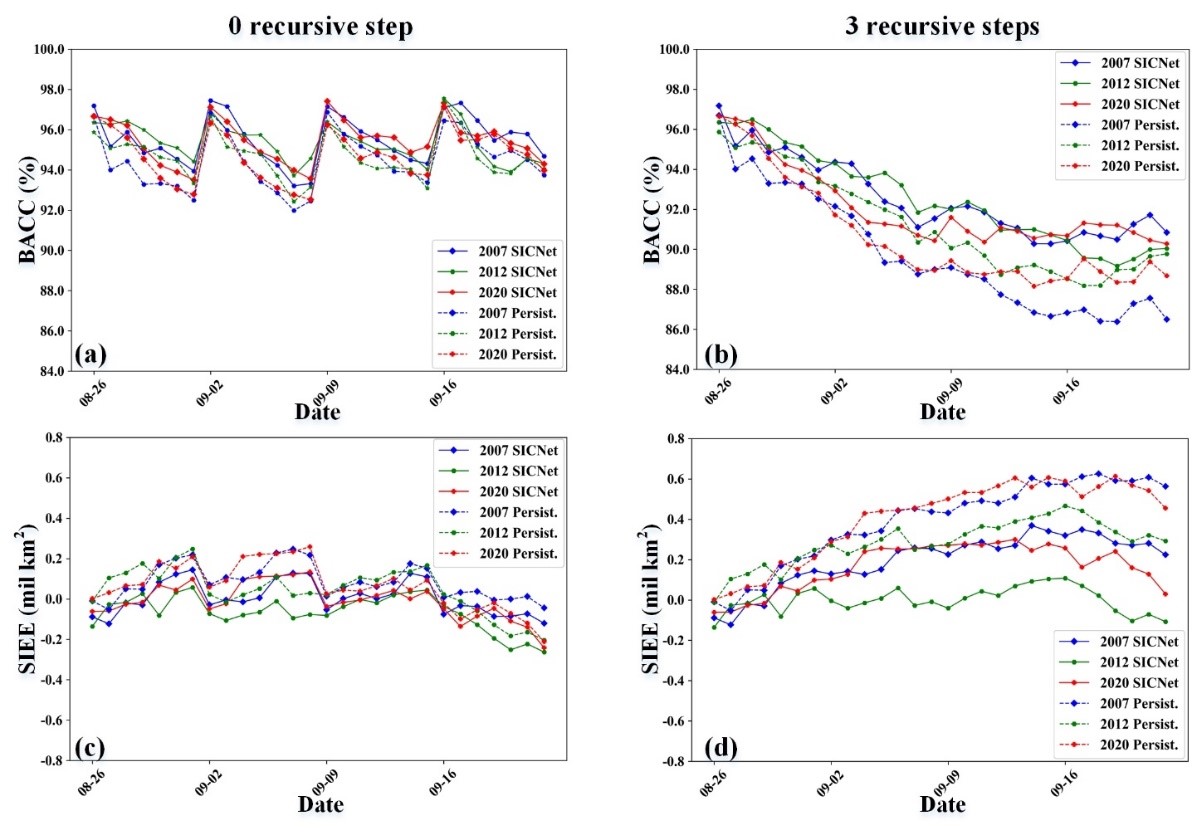 SICNet以深度卷积网络为基本单元,融合时间卷积网络建立时空注意力模块,以更好地建立海冰密集度历史序列与未来序列的时空映射关系。SICNet以近7天海冰密集度历史数据为输入,输出未来7天海冰密集度,迭代3次预测未来28天的逐日海冰密集度,预报时间为秒级。SICNet对未来7天海冰密集度预报的平均绝对误差为2.67%,连续28天预报的平均海冰边界预报精度(BACC)基本保持在90%以上,明显优于气候异常持续(Persist)。