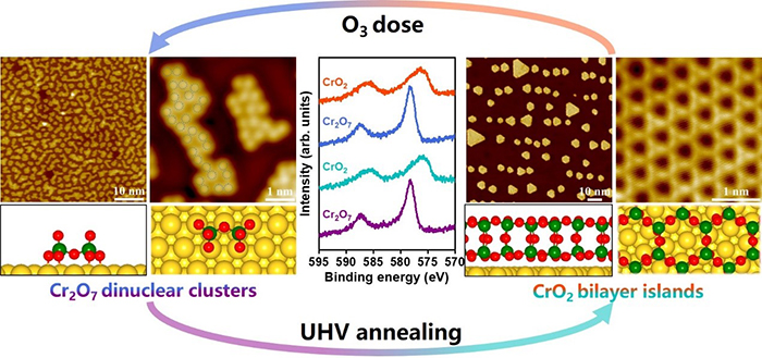 在本工作中,研究人员在Au(111)表面上制备得到二维CrO2双层纳米岛,与体相稳定的Cr2O3结构具有不同的原子构象;该纳米岛结构在暴露O3处理后,可自发分散并形成单分散的Cr2O7双核团簇结构,CrO2双层纳米岛和Cr2O7双核团簇通过真空退火和氧化处理,可以进行动态的可逆转化。研究表明,除了Au(111)基底的界面限域效应,O3解离产生的原子氧物种在稳定单分散Cr2O7双核团簇中也发挥重要作用。本工作揭示了界面和气氛对氧化物纳米结构动态变化的协同限域效应。