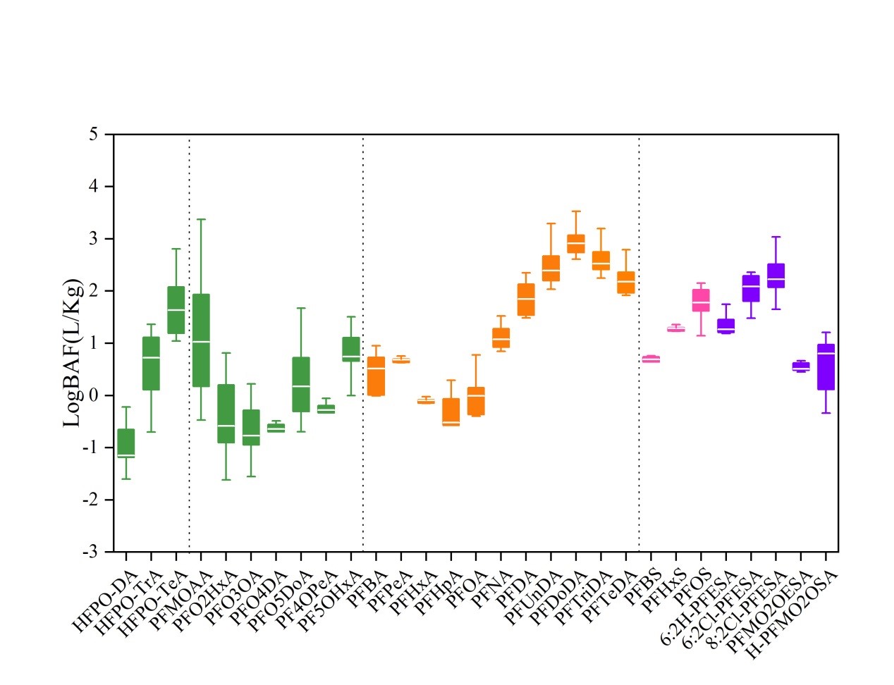 通过分析PFAS的生物富集因子,发现对于PFECAs(从PFMOAA到PFO4DA),随着碳链长度和醚氧基团的增加,log BAF值呈下降趋势,然后到PFO5DoA又呈上升趋势(图2)。在只含有一个醚氧基的PFECAs同系物(PFMOAA、PF4OPeA和PF5OHxA)中也发现了类似的结果:log BAF值随碳链长度的增加呈现先减小后升高的趋势。对于C4-C7的全氟羧酸(PFCAs),生物体的log BAF值随着碳链长度的增加而降低,然而对于C8-C12 PFCAs则随着碳链长度的增加呈线性增加趋势,在PFDoDA达到峰值。这一发现表明全氟烷基链长度和官能团可能会影响PFECAs的生物累积。