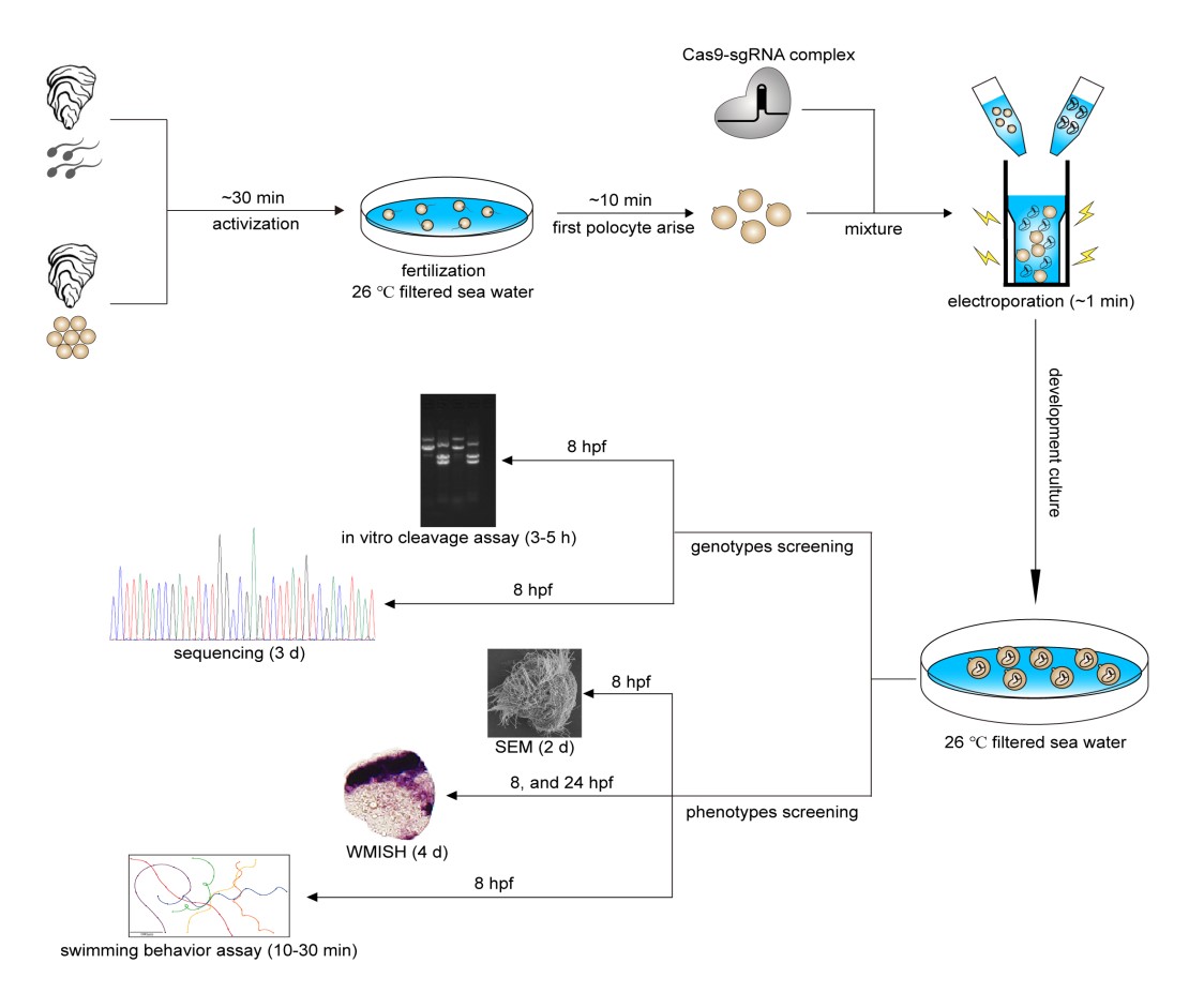 牡蛎为世界大宗水产养殖贝类,但和水产鱼类相比,基因组编辑育种技术在牡蛎中应用还处于起步阶段。针对牡蛎卵径小(~50 m)、显微操作难、幼虫死亡率高、间接发育时间时间长以及在获得可遗传纯系方面难度大、成本高、耗时长的难题,中科院海洋所张琳琳研究团队经过长期的研究攻关,搭建了一套基于电穿孔的Cas9/sgRNA复合物高通量递送和突变体快速检测的技术平台,成功实现了对牡蛎(Crassostrea gigas angulate)基因组中标记基因( -tubulin)的高效编辑。