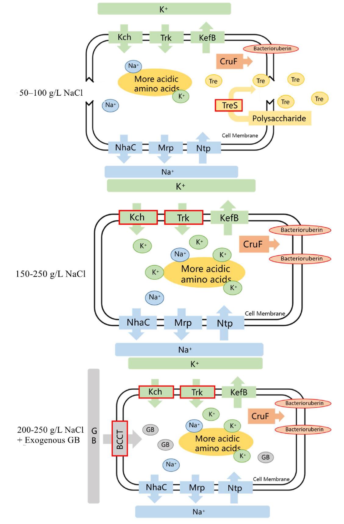 中科院海洋所刘建国研究员团队从高盐水体中分离获得一株嗜盐古菌,通过生理生化和基因组学研究发现,该嗜盐古菌含有摄取钾离子的基因 trkA/trkH/kch、钾离子转运基因 kefB、合成海藻糖的基因treS、以及摄取甘氨酸甜菜碱的甜菜碱/肉碱/胆碱转运蛋白家族基因,在不同盐浓度下呈现完全不同的渗透调节响应转变机制。
