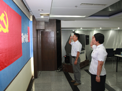 在周峰的带领下,新发展的预备党员王芳在党旗下庄严宣誓。