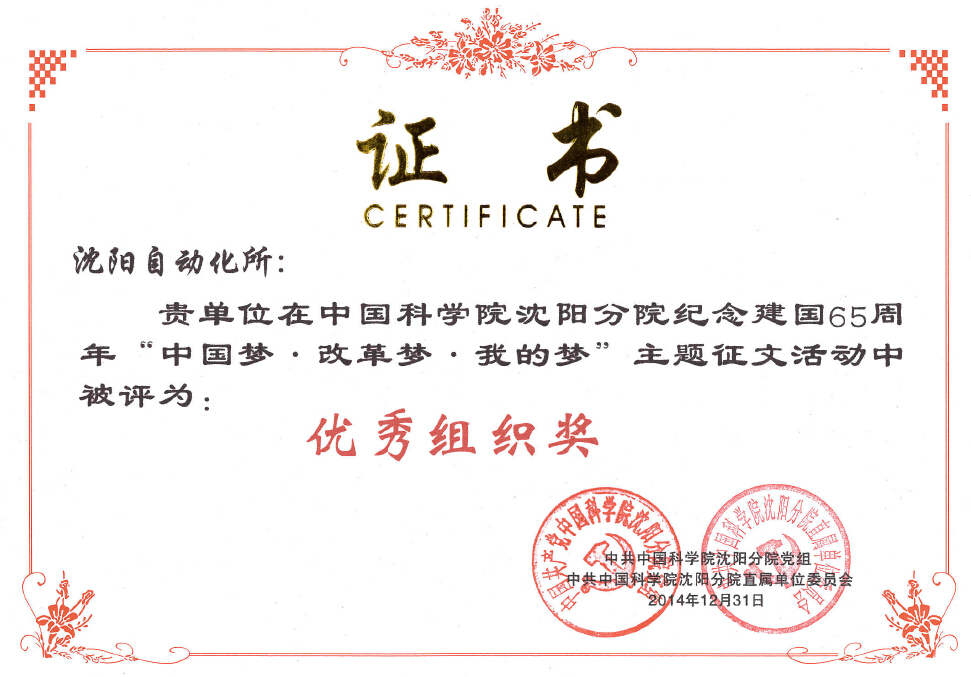 近日,从中国科学院沈阳分院获悉,中国科学院沈阳自动化研究所在2014年参加的沈阳分院纪念建国65周年“中国梦•改革梦•我的梦”主题征文活动中获评优秀组织奖。由沈阳自动化所选送的6篇作品全部获奖。